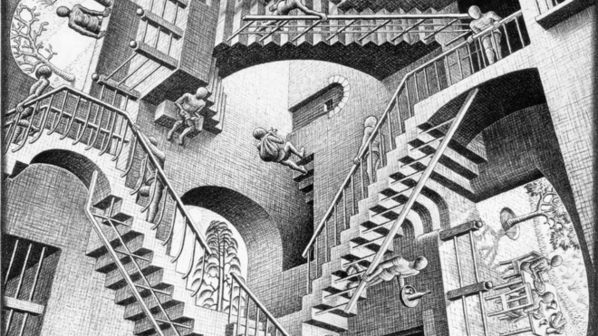 As I was reading our Gospel passage this week, I suddenly remembered the work of M.C. Escher. Escher was a meticulous illustrator who played with shapes and architecture to create images and landscapes that distort our sense of human reality. Take, for example, the drawing “Relativity,” which appeared at the top of our eNews this week. In this artwork there are three prominent staircases that intersect with one another at impossible angles. Faceless figures walk through architectural space on different planes, as if gravity was working in three directions all at once. This image is both playful and, admittedly, a bit eerie. I remembered Escher because it struck me that this is a very good depiction of a house divided.